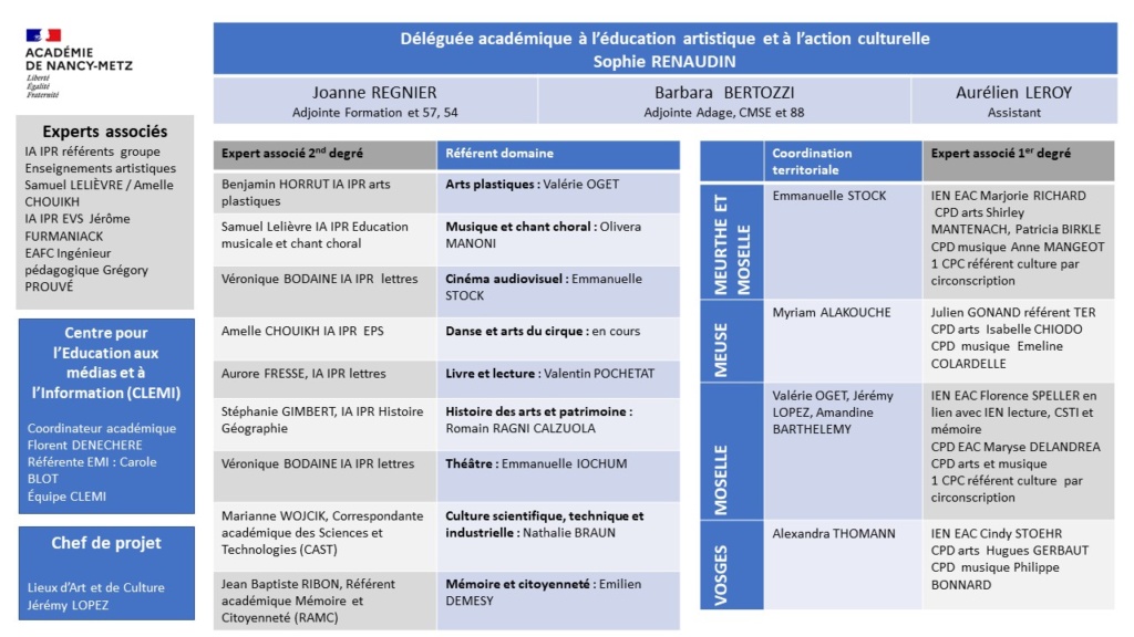 Sous l’autorité de monsieur le Recteur, la déléguée académique à l’éducation artistique et à l’action culturelle, est garante de la cohérence de l’éducation artistique et culturelle à l’école en concertation avec les corps d’inspection et les partenaires. Dans chaque département, la DAAC travaille avec les IA-DASEN, et les IEN chargés de mission EAC qui les représentent.